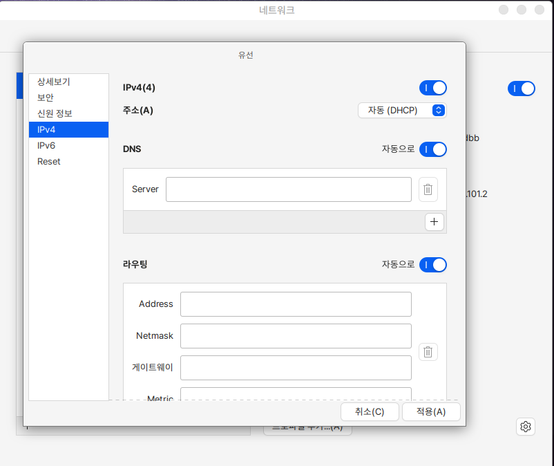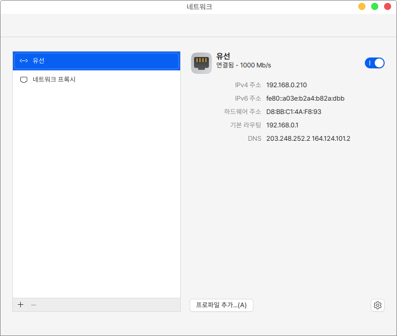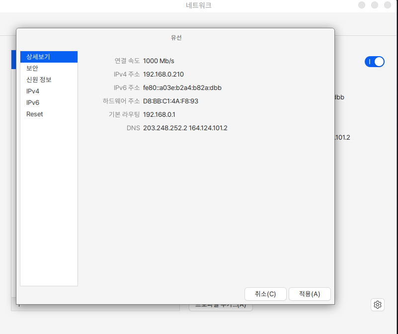 네트워크로 현재 연결되어 있는 IP의 상세정보나 무선인터넷을 확인하고, IP를 추가할 수 있습니다