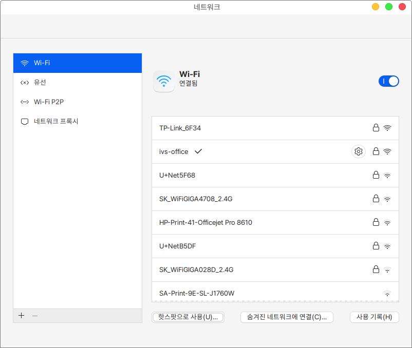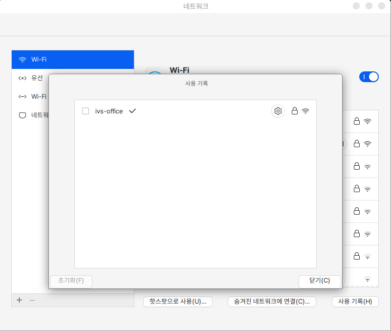 무선 인터넷을 연결하면 좌측 사이드바에 Wi-Fi 항목이 보여지고, 연결 가능한 와이파이 목록과 와이파이 사용기록을 확인할 수 있습니다.