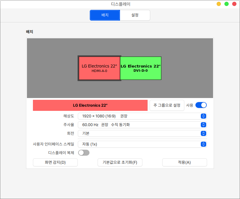 모니터의 위치, 해상도, 주사율 등 다양한 옵션을 설정할 수 있으며 마우스를 이용하여 모니터의 배치를 좌우로 쉽게 변경할 수 있습니다.