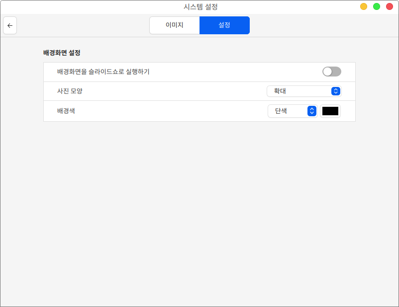 설정 항목에서는 배경화면 이미지의 슬라이드 쇼 실행 여부와 사진 모양, 배경색 설정이 가능합니다.