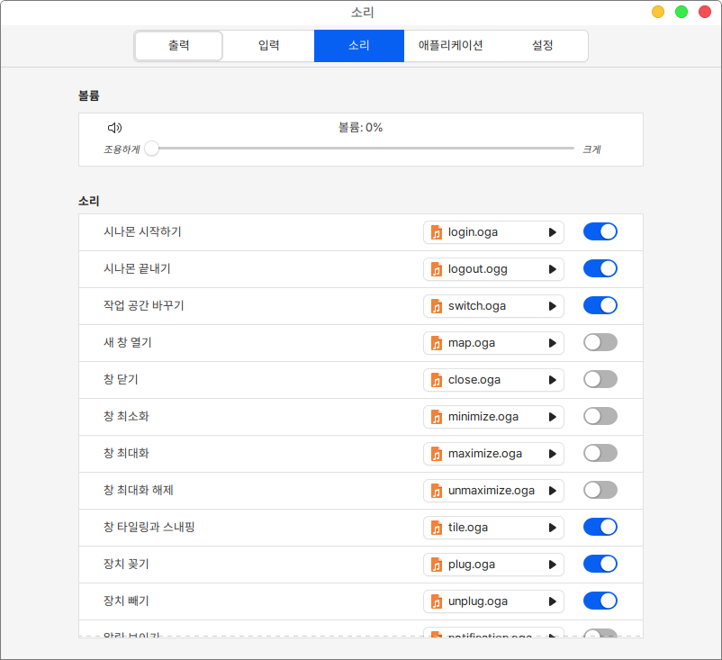 상단의 소리 탭 메뉴에서는 시스템에 사용되는 효과음에 대한 설정도 쉽게 가능합니다.