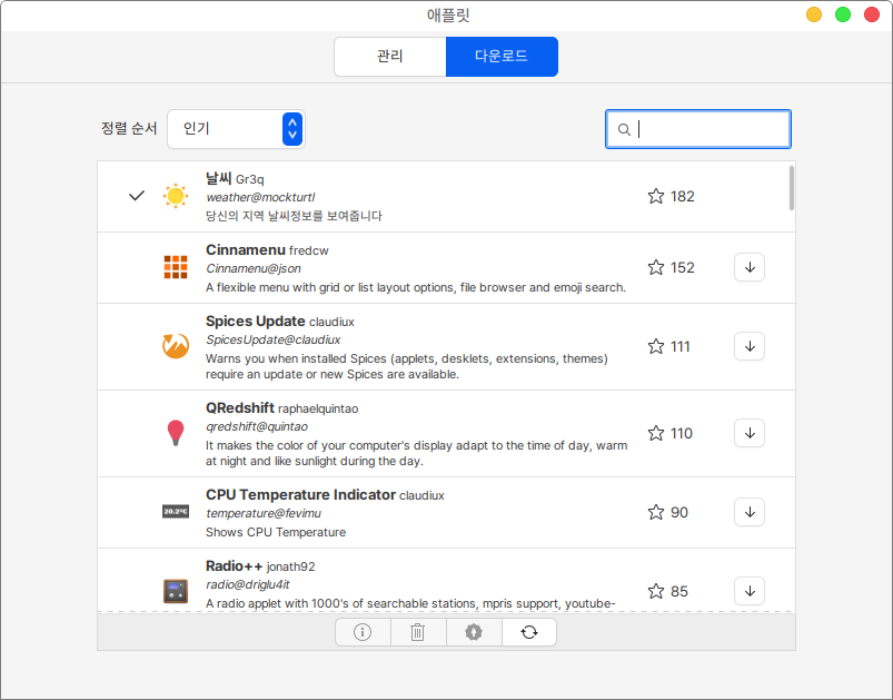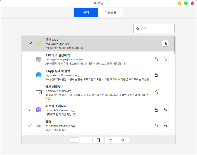 관리 항목에서 다운로드 받은 애플릿을 확인하고 관리할 수 있습니다.