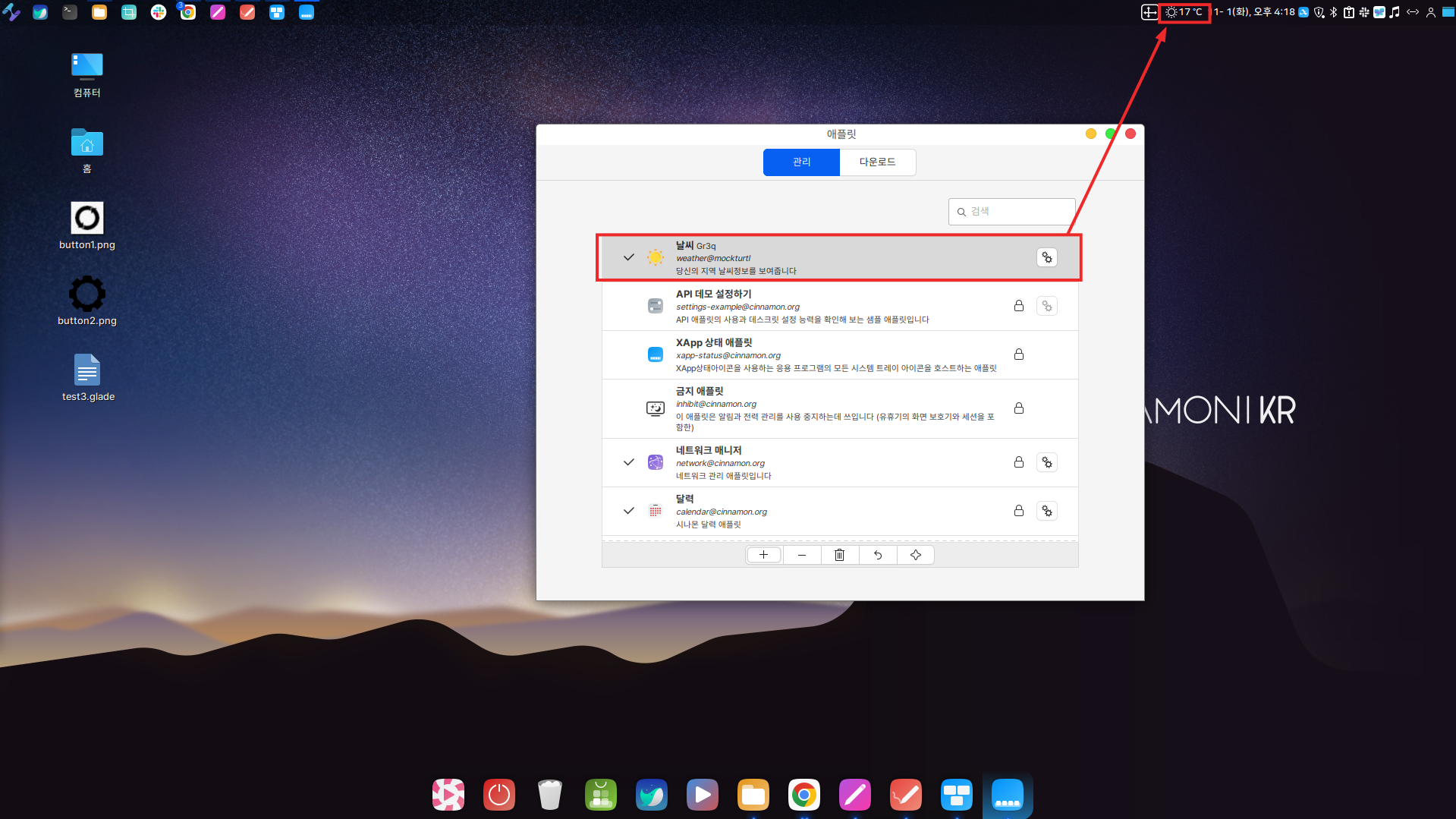 애플릿이란 특정한 작업을 수행하는 작은 응용 프로그램으로 추가한 애플릿은 화면 상단의 패널 우측에서 확인이 가능합니다.