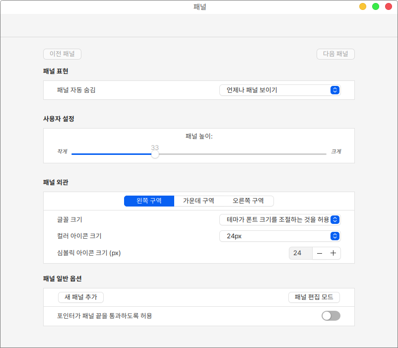 패널 일반 옵션을 통해서는 새 패널을 추가할 수 있습니다.