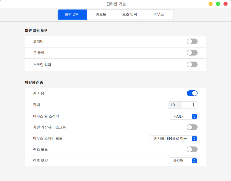 화면 알림 항목에서는 화면 알림 도구를 통해 보여지는 화면 설정이 가능하고, 줌 사용 여부와 줌에 관련된 설정을 할 수 있습니다.
