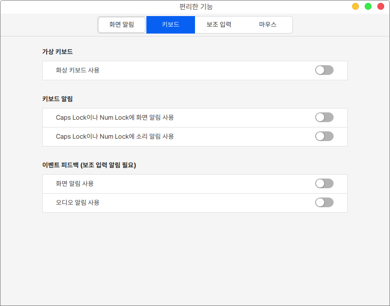 키보드 항목에서는 가상 키보드 사용과 키보드 알림 여부를 설정할 수 있습니다.