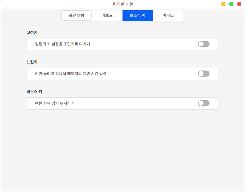 보조 입력 항목에서는 고정키, 느린키, 바운스 키 설정이 가능합니다.